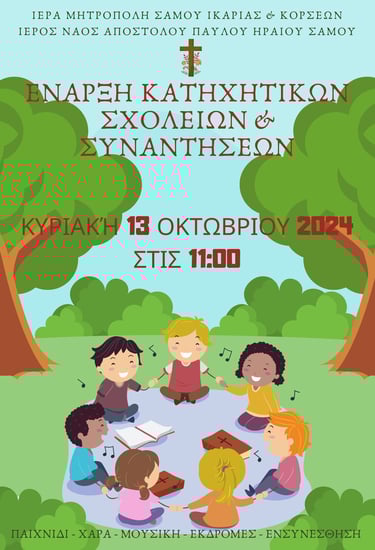 Μετὰ χαρᾶς σᾶς ἀνακοινοῦμεν τὴν ἔναρξη τῶν κατηχητικῶν σχολείων τοῦ Ἱεροῦ Ναοῦ Ἀποστόλου Παύλου Ἡραίου Σάμου. Τὴν Κυριακή, 13 Οκτωβρίου 2024, στὶς 11:00 π.μ., στὸ προαύλιο τοῦ Ἱεροῦ Ναοῦ, θὰ τελέσουμε τὸν Ἀγιασμὸ καὶ θὰ ἀρχίσουμε τὸ ταξίδι μας στὴν πνευματικὴ γνώση καὶ τὴ χριστιανικὴ ἀγωγή.