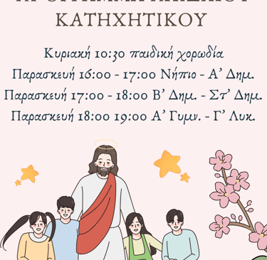 Μετὰ χαρᾶς σᾶς παρουσιάζουμε τὸ πρόγραμμα τοῦ παιδικοῦ μας κατηχητικοῦ, τὸ ὁποῖο εἶναι σχεδιασμένο μὲ πολλὴ ἀγάπη καὶ φροντίδα γιὰ τὴν πνευματικὴ ἀνάπτυξη των μικρών μας φίλων. Στόχος μας εἶναι νὰ βοηθήσουμε νὰ γνωρίσουν τα παιδιά τὸν Χριστό, νὰ ἀγαπήσουν τὴν Ἐκκλησία μας καὶ νὰ ζήσουν σύμφωνα μὲ τὶς χριστιανικὲς ἀρχές.